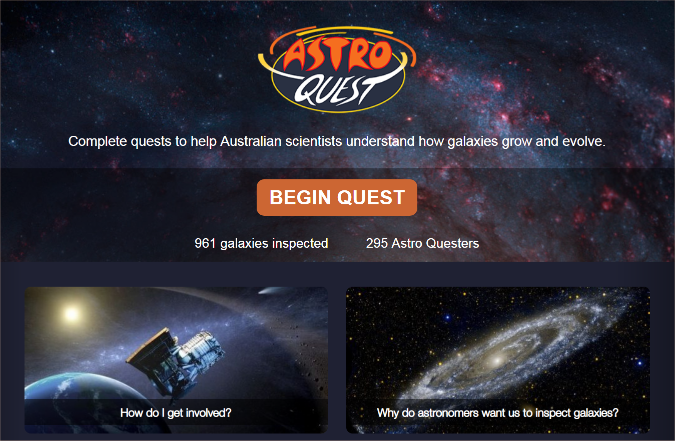 Sito di AstroQuest, dal quale ci si può registrare per contribuire alla ricerca identificando le galassie nelle immagini. Crediti: Icrar/AstroQuest