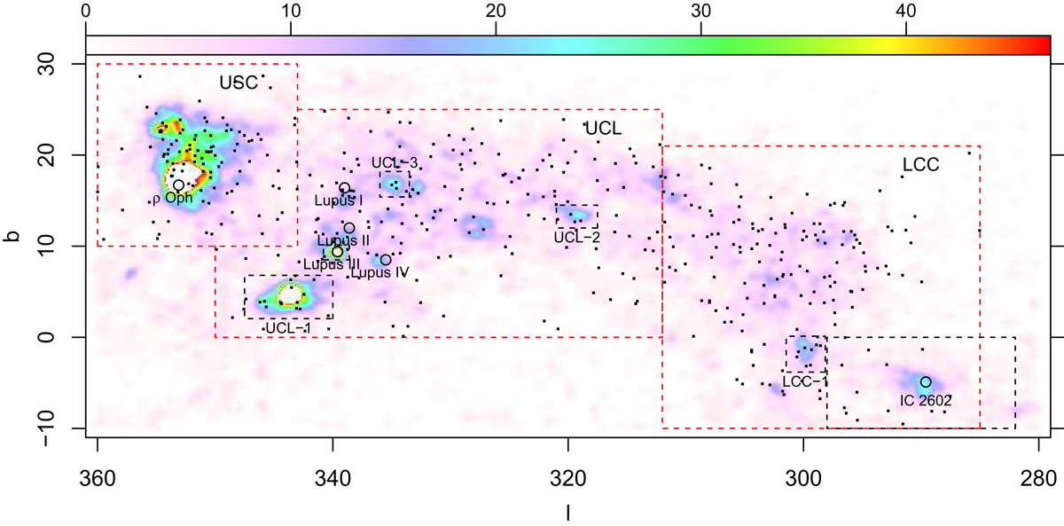 Mappa della densità stellare di Sco OB2 ottenuta in questo studio, con evidenziate le regioni caratterizzate da una popolazione stellare più ricca