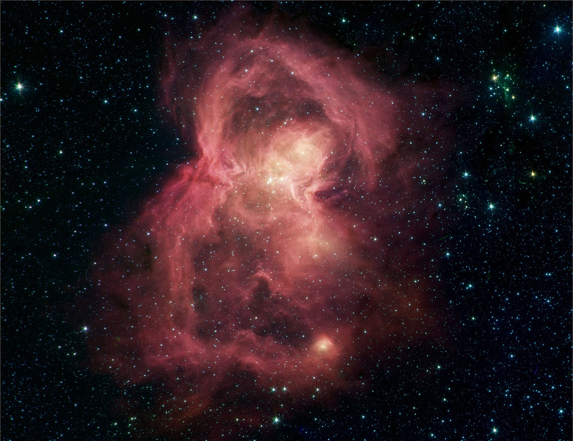 Quello che vedete in questa pagina è un mosaico ottenuto dalle osservazioni di Spitzer della regione di formazione stellare W40, originariamente pubblicato come parte di un vasto studio a raggi infrarossi e raggi X (MYStIX) di giovani ammassi stellari. L’immagine di Spitzer è composta da quattro immagini scattate con la Infrared Array Camera (Irac) del telescopio durante la sua missione principale, a diverse lunghezze d’onda della luce infrarossa: 3.6, 4.5, 5.8 e 8.0 micron (indicati come blu, verde, arancione e rosso). Le molecole organiche di carbonio e idrogeno, chiamate idrocarburi policiclici aromatici (Ipa), sono eccitate dalla radiazione interstellare e diventano luminescenti a lunghezze d’onda vicine a 8 micron, conferendo alla nebulosa le sue caratteristiche rossastre. Le stelle sono più luminose alle lunghezze d’onda più corte, apparendo più blu. Alcune delle stelle più giovani sono circondate da dischi di polvere, che si illuminano di una tonalità gialla o rossa.