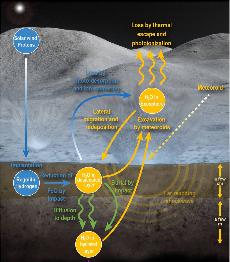 A ogni impatto, una piccola onda d’urto estrae ed espelle acqua dall’area circostante. Siccome il materiale sulla superficie lunare è soffice, anche un meteorite da pochi millimetri può penetrare abbastanza in profondità da rilasciare uno sbuffo di vapore. La maggior parte di quel vapore si disperde velocemente nello spazio, ma circa un terzo si deposita sulla superficie della Luna.