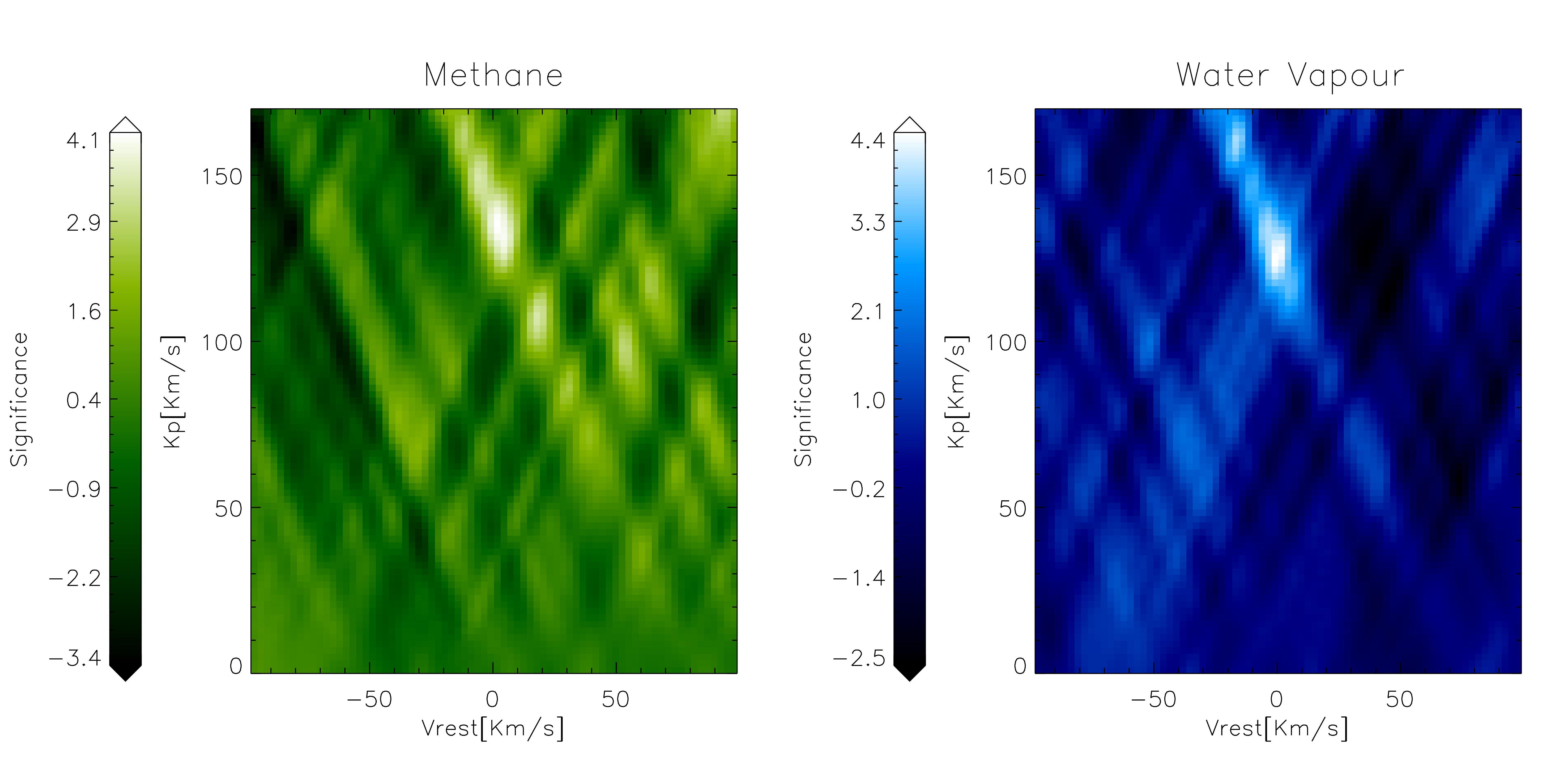 La figura mostra il segnale di cross-correlazione totale eseguito tra gli spettri Giano e i modelli contenenti CH4 (pannello di sinistra) e H2O (pannello di destra). Crediti: G. Guilluy et al.