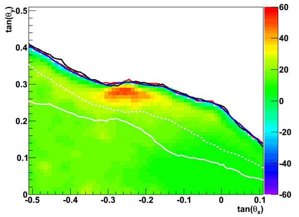 Differenza tra il flusso di muoni misurato e quello calcolato con una simulazione Monte Carlo. La linea blu indica il profilo del vulcano Stromboli visto dal rivelatore. La zona a bassa densità nell’area sommitale del vulcano è evidenziata dal colore rosso