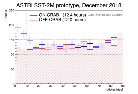 Diagramma – detto “alfa plot” – relativo all’osservazione si è svolta nel dicembre 2018 con ASTRI-Horn. Le osservazioni sono state eseguite puntando la Nebulosa del Granchio per 12,4 ore (croci blu) e puntando un altro campo senza alcuna sorgente di raggi gamma per altre 12 ore al fine di valutare il rumore di fondo (croci rosse). Confrontando l’eccesso di conteggi nella direzione della Nebulosa del Granchio rispetto al rumore di fondo, si vede chiaramente il segnale dovuto ai raggi gamma emessi dalla Nebulosa del Granchio