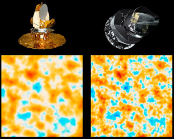 WMap (a sinistra) e Planck (a destra), con porzioni delle rispettive mappe del fondo cosmico a microonde. Crediti: Nasa/Jpl-Caltech/Esa