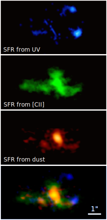 Mappa della formazione stellare nel sistema Pj308-21, tracciata dall’emissione Uv prodotta dalle stelle giovani, dal gas che emette nella riga del carbonio ionizzato, [CII], e dalle polveri interstellari. La sovrapposizione delle tre mappe, mostrata nell’ultimo pannello, enfatizza la complicata interconnessione fra le varie componenti. Figura adattata da Decarli et al. (2019) ApJ