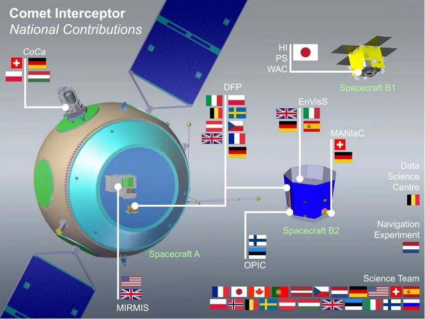 Comet Interceptor sarà la prima missione a visitare una cometa veramente incontaminata, oppure un altro oggetto interstellare che si dovesse presentare nelle vicinanze, tipo ‘Oumuamua. Viaggerà verso il corpo celeste, ancora sconosciuto, effettuando un sorvolo quando questo si troverà in prossimità dell’orbita terrestre. È dotato di tre sonde che eseguiranno osservazioni simultanee da più punti attorno alla cometa, creando un profilo tridimensionale dell’oggetto “dinamicamente nuovo”, contenente materiale non trasformato, sopravvissuto dagli albori del Sistema solare.