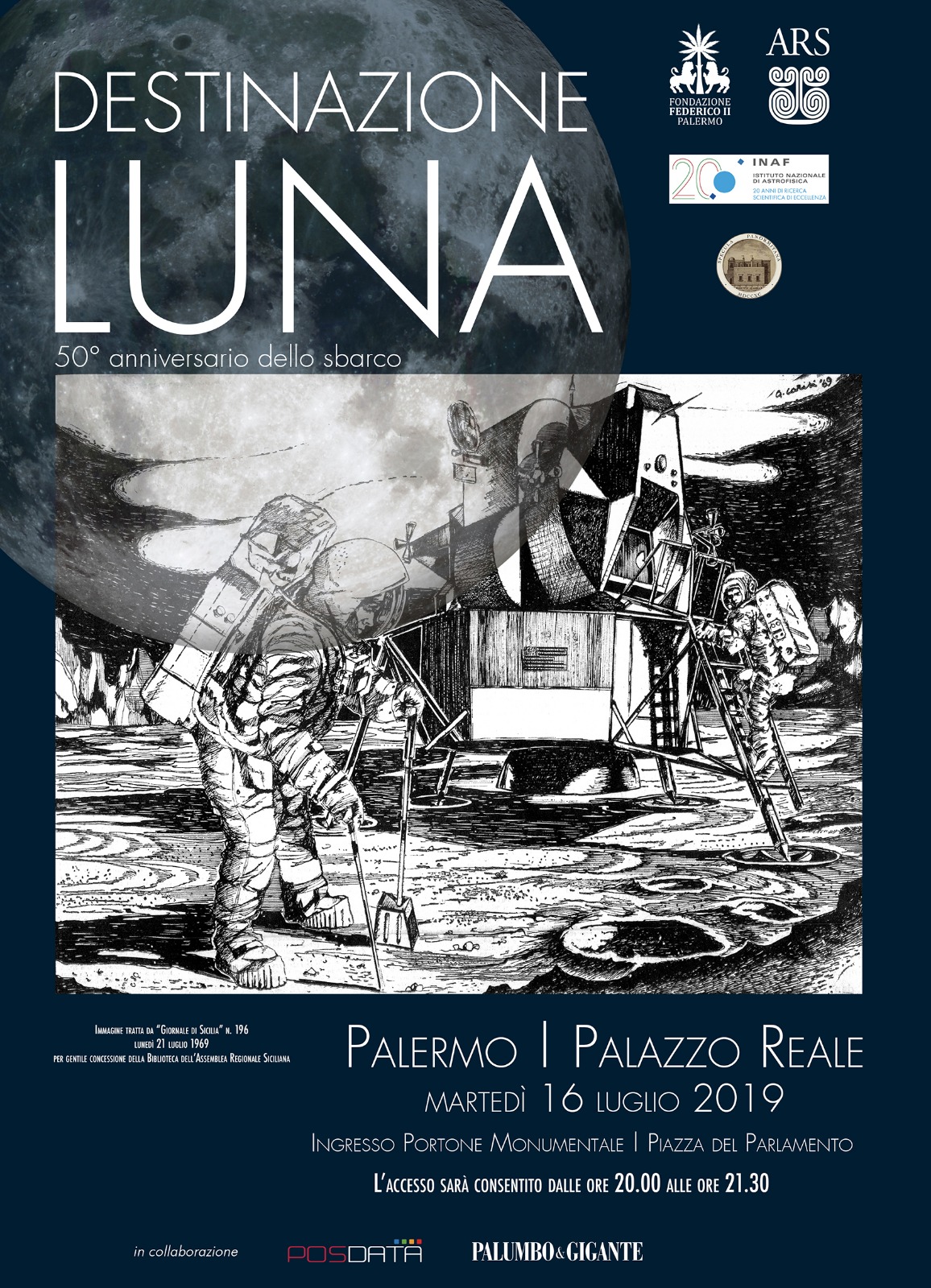 “Destinazione Luna. 50° anniversario dello sbarco” sarà un evento istituzionale, su inviti. A dare il benvenuto agli ospiti saranno infatti il presidente dell’Ars Gianfranco Miccichè, il direttore generale della Fondazione Federico II Patrizia Monterosso e il direttore dell’Inaf – Osservatorio astronomico G. S. Vaiana di Palermo Fabrizio Bocchino che, a proposito di questa data indimenticabile, dice: «Il 50esimo sbarco sulla Luna capita in un momento storico molto particolare: è infatti da più di quarant’anni che non mettiamo piede sulla Luna. Da qualche anno la Nasa ha annunciato un piano di ritorno umano sul nostro satellite naturale, è quindi il momento giusto per interrogarci sulle motivazioni che ci hanno spinto a compiere questa grande impresa epica, a interromperla e ora a riprogrammarla».