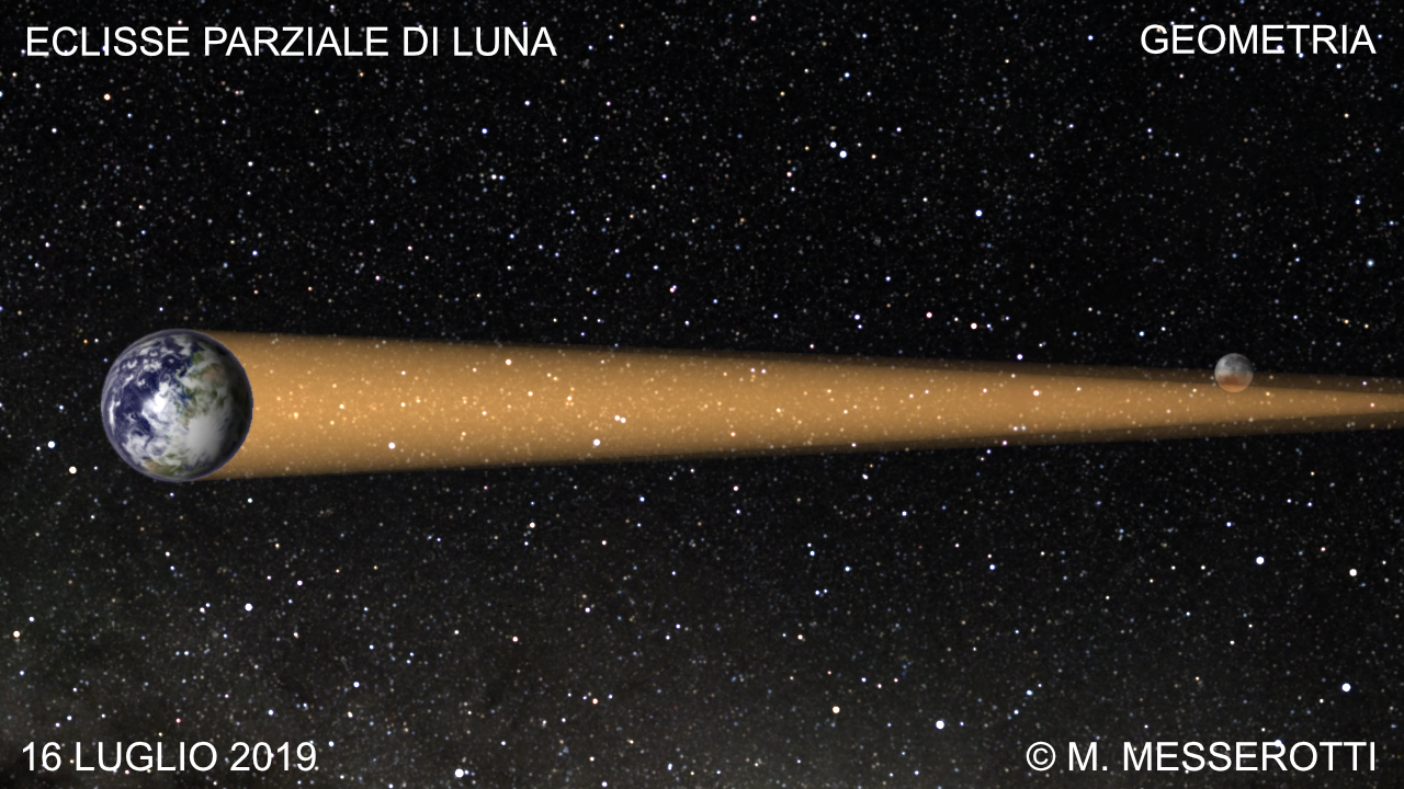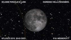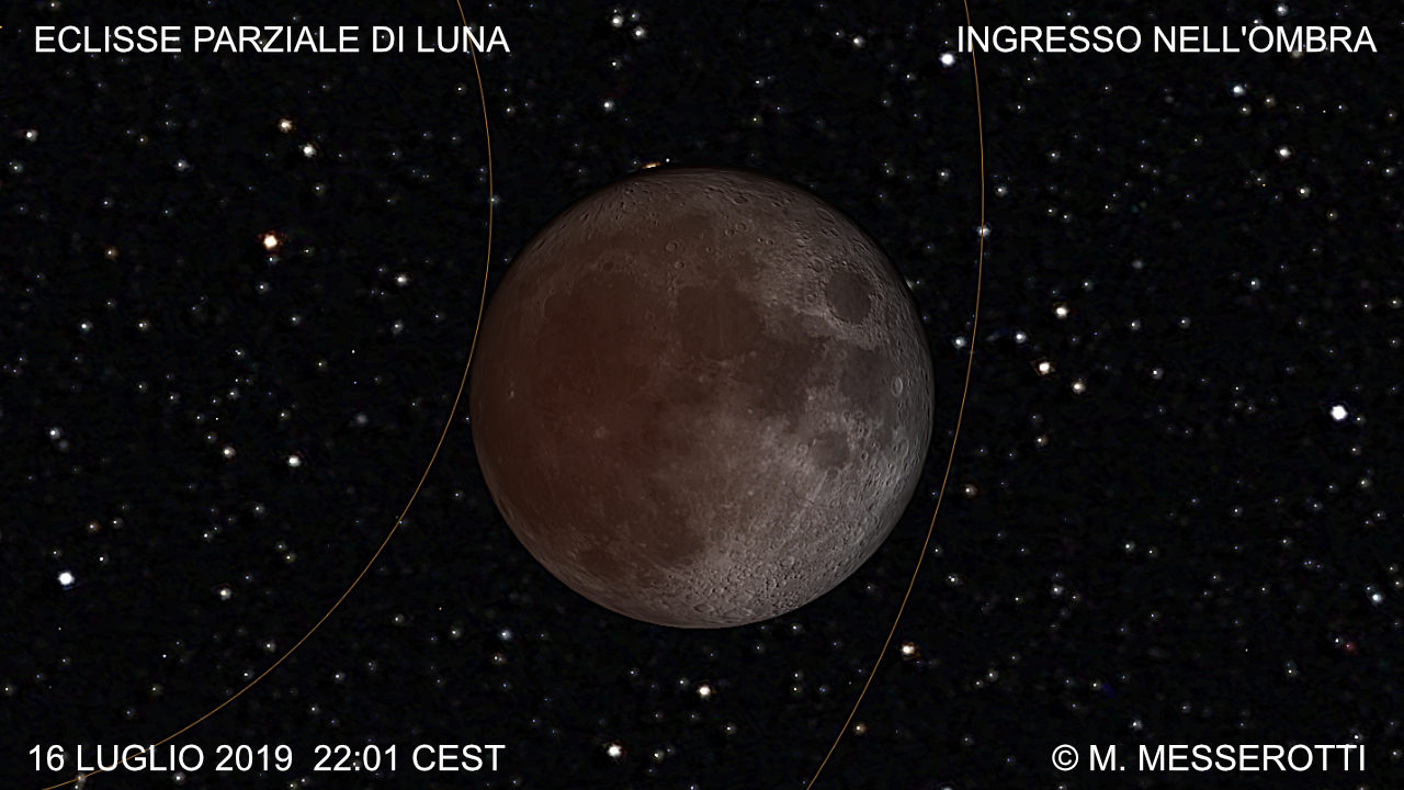 Martedì 16 Luglio 2019 la Luna entrerà nel cono di penombra della Terra alle 20:43 CEST (Tempo Estivo Europa Centrale = tempo mostrato dall’orologio nell’Europa Centrale e quindi anche in Italia) proprio quando sorgerà a Trieste, ma il Sole tramonterà qualche minuto più tardi alle 20:50 CEST. Questa fase di eclisse penombrale sarà perciò difficile da osservare nella sua fase iniziale, perché la luminosità del cielo sarà ancora predominante.