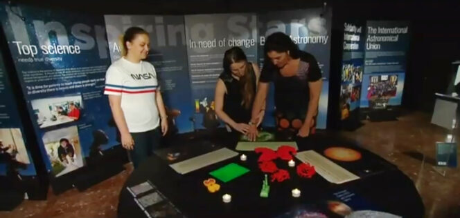 L’esposizione Inspiring Stars, nata nel 2017 da un’idea di Lina Canas, Maria Rosaria D’Antonio e Wanda Diaz Merced della Iau, comprende varie installazioni per l’esplorazione multisensoriale dell’universo: exhibit tattili, libri, mappe e modelli 3D di pianeti, costellazioni e galassie. Ma anche telescopi e software per la sonificazione di dati astronomici, per migliorare l’inclusione e integrazione delle disabilità visive anche nella ricerca professionale, garantendo a tutti l’accesso ai dati scientifici.