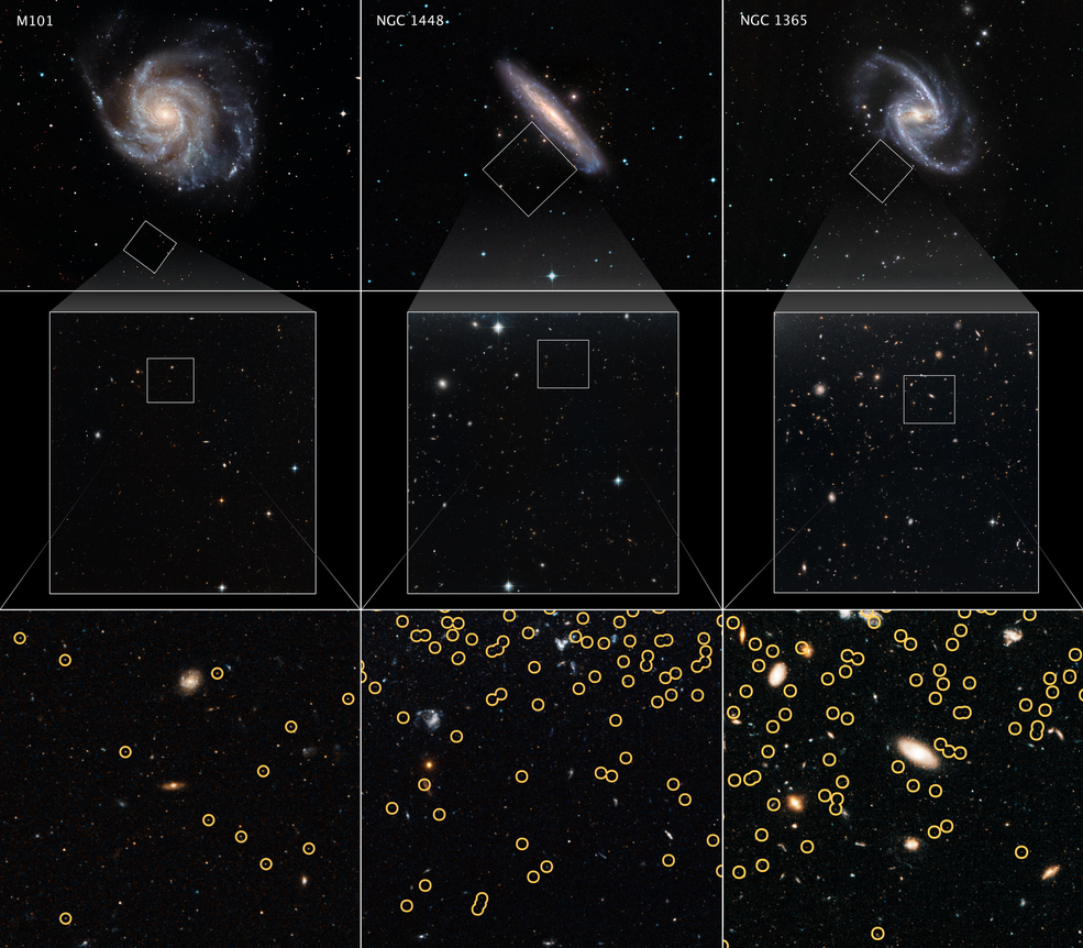 Queste galassie sono state selezionate da un programma di osservazioni con telescopio spaziale Hubble per misurare il tasso di espansione dell’universo, chiamato costante di Hubble. La potenza del telescopio ha permesso di trovare stelle giganti rosse – identificate da cerchi gialli nel riquadro più in basso – negli aloni stellari delle galassie ospiti. Crediti: Nasa, Esa, W. Freedman (University of Chicago), Eso, Digitized Sky Survey