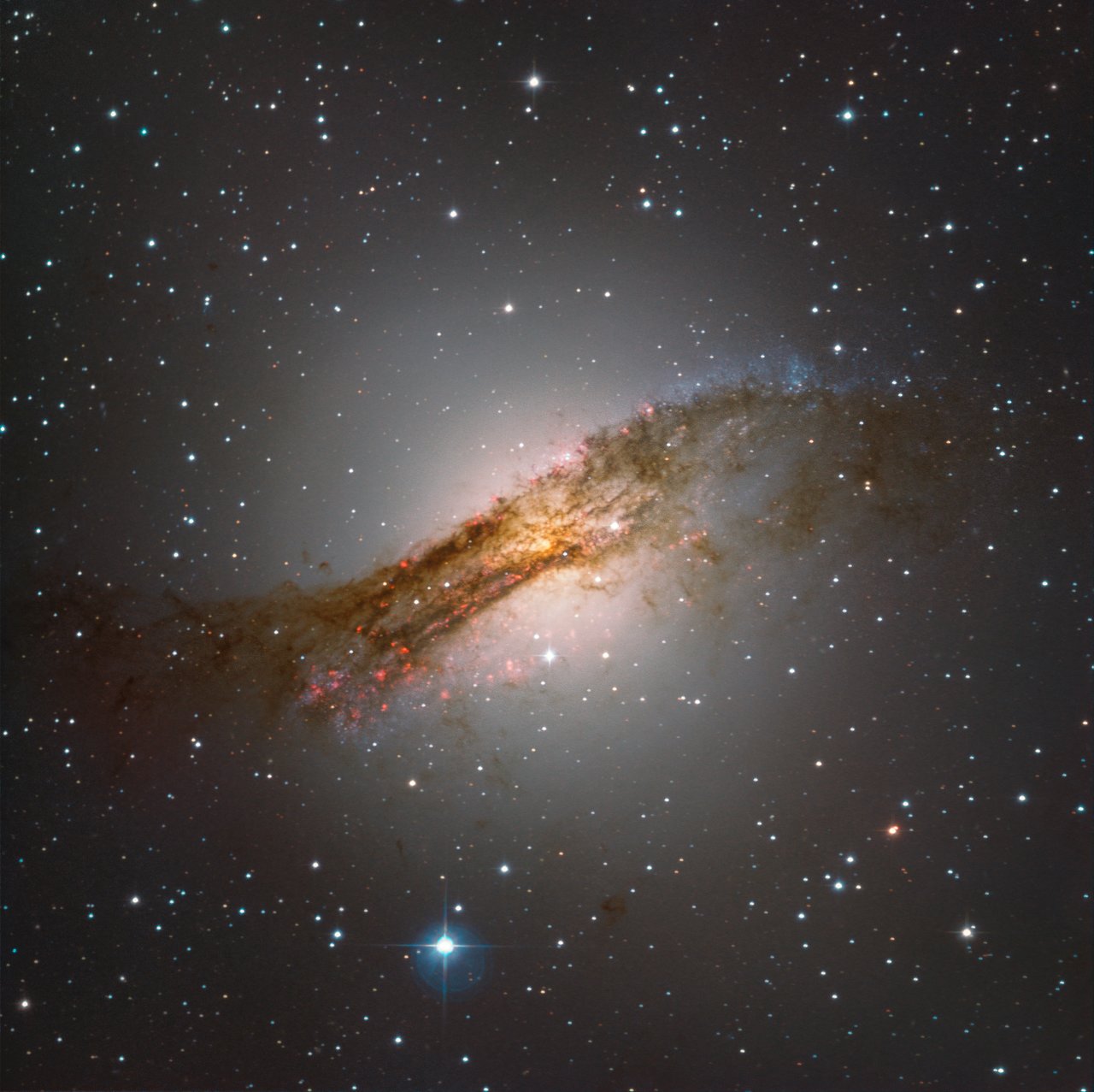 La galassia Centaurus A (Ngc 5128) è uno degli oggetti più luminosi nel cielo notturno dell’emisfero meridionale, situata nella costellazione del Centauro. Fu scoperta nel 1826 dall’astronomo scozzese James Dunlop, presso l’ex osservatorio Parramata. A una distanza di 11 milioni di anni luce, essa è il nucleo galattico attivo (Agn) più vicino a noi. Gli astronomi teorizzano che quella che era originariamente una galassia ellittica si sia scontrata con una galassia a spirale; relativamente più piccola, dandole la peculiare forma che vediamo ora. Ngc 5128 ha un’impressionante collezione di stelle. Da questa immagine, è possibile osservare le regioni di formazione stellare rosso/rosa nella parte inferiore sinistra dell’immagine e i giovani ammassi stellari blu nella parte superiore destra dell’immagine; con strisce di polvere catturate con dettagli sbalorditivi.