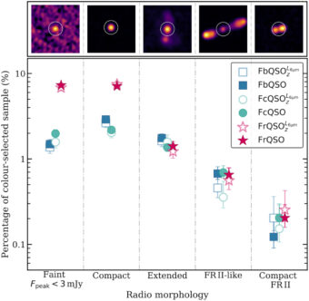 Percentuale di quasar blu e rossi in relazione alla morfologia rilevata nella banda radio. Per sorgenti compatte e deboli i quasar rossi (stelle rosse) sono più numerosi rispetto a quelli blu (quadrati blu e pallini verdi). Non vi sono sostanziali differenze tra quasar rossi e blu per le altre tipologie di morfologie. Crediti: Klindt L. et al..