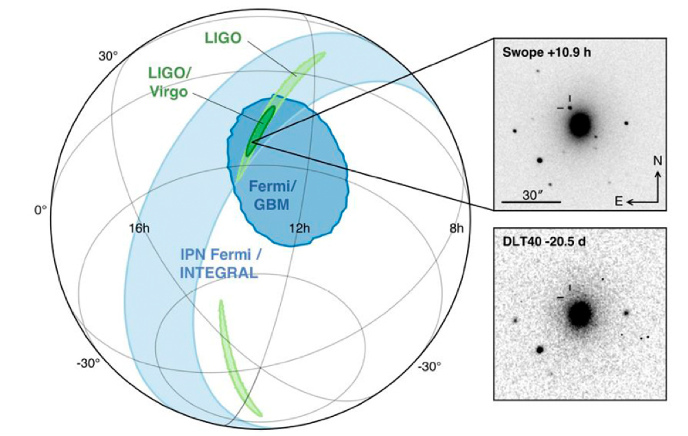 Localizzazione di Gw 170817 (che, oltre al segnale gravitazione, ha prodotto anche un segnale gamma rivelato da Fermi e Integral) e scoperta della controparte ottica (immagine in altro a destra) che si è accesa dove le immagini d’archivio non mostravano niente (immagine in basso a destra)