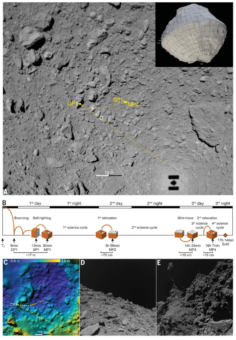 Traiettoria ricostruita del lander Mascot. (A) Immagine della Optical Navigation Camera (Onc) di Hayabusa2 con un inserto, in alto a destra, in cui è stata indicata la posizione del lander. La traiettoria di discesa di Mascot e i suoi rimbalzi sono riportati in giallo. I campi di vista ripresi da Mascam nelle due immagini di discesa mostrate sotto (immagini “D” e “E”) sono indicati da linee bianche. Il primo punto di contatto è indicato come CP1. (B) Schema della sequenza temporale di Mascot dal suo rilascio, avvenuto in T0. Dopo il rimbalzo sulla superficie, Mascot ha raggiunto SP1 e acquisito i dati in diverse posizioni di misurazione (da MP1 a MP4) fino alla fine della missione (EoM) in MP4. (C) Un modello digitale di 50×50 metri del terreno in cui Mascot è atterrato, che riporta l’altezza codificata per colore (definita rispetto alle coordinate topografiche locali, relative al piano tangenziale locale). “MR” è il punto di rilascio di Mascot. I puntini gialli indicano le posizioni di Mascot osservate nelle immagini della Onc. (D) Immagine scattata durante la discesa e (E) immagine dei massi a CP1 (la scala cambia con la distanza; il masso nell’immagine, D in basso a sinistra, è di circa 1 m). Crediti: Jaumann et al., Science (2019)