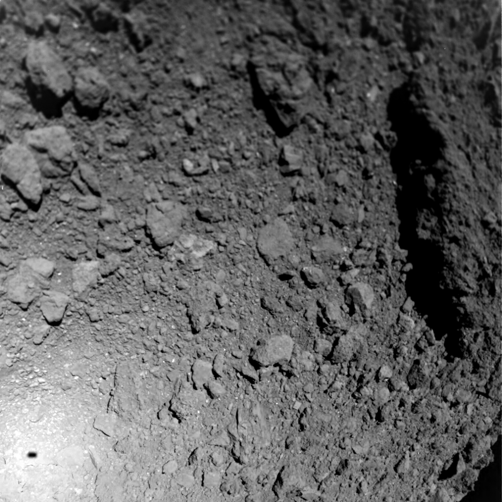 Mentre il lander si avvicinava alla superficie, la sua macchina fotografica ha scattato immagini che hanno consentito a Jaumann di ricostruire la traiettoria di Mascot, che è sceso lentamente ed è rimbalzato sulla superficie prima di assestarsi. Ulteriori immagini riprese dalla superficie mostrano che l’asteroide è coperto di rocce e massi appartenenti a due diverse categorie: alcuni scuri e ruvidi, altri luminosi e lisci. Entrambi i tipi di roccia sono distribuiti quasi uniformemente sulla superficie, a supporto della teoria secondo la quale Ryugu si sia formato dalle macerie prodotte da un impatto avvenuto sul corpo genitore, che si sono successivamente riaggregate. Molte rocce presentano piccole inclusioni colorate simili a quelle trovate in condriti carbonacee, indicando che potrebbero contenere il minerale olivina. Inaspettatamente, le immagini non hanno mostrato particelle fini o polvere sulla superficie, che in realtà ci si aspetterebbe si accumulassero nello spazio. Gli autori ritengono che debba esistere un meccanismo fisico non identificato che rimuove efficacemente la polvere dalla superficie dell’asteroide.
