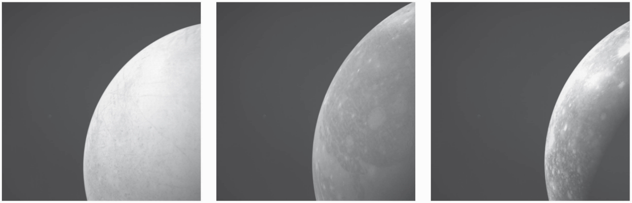 Immagini che rappresentano come Juice vedrà le lune Europa (a sinistra), Ganimede (al centro) e Callisto (a destra) con la sua NavCam. Per generare queste immagini, la NavCam è stata alimentata con viste simulate – basate su immagini esistenti delle lune – per elaborare viste realistiche di ciò che ci si può aspettare una volta nel Sistema di Giove. Crediti: Airbus Defence and Space