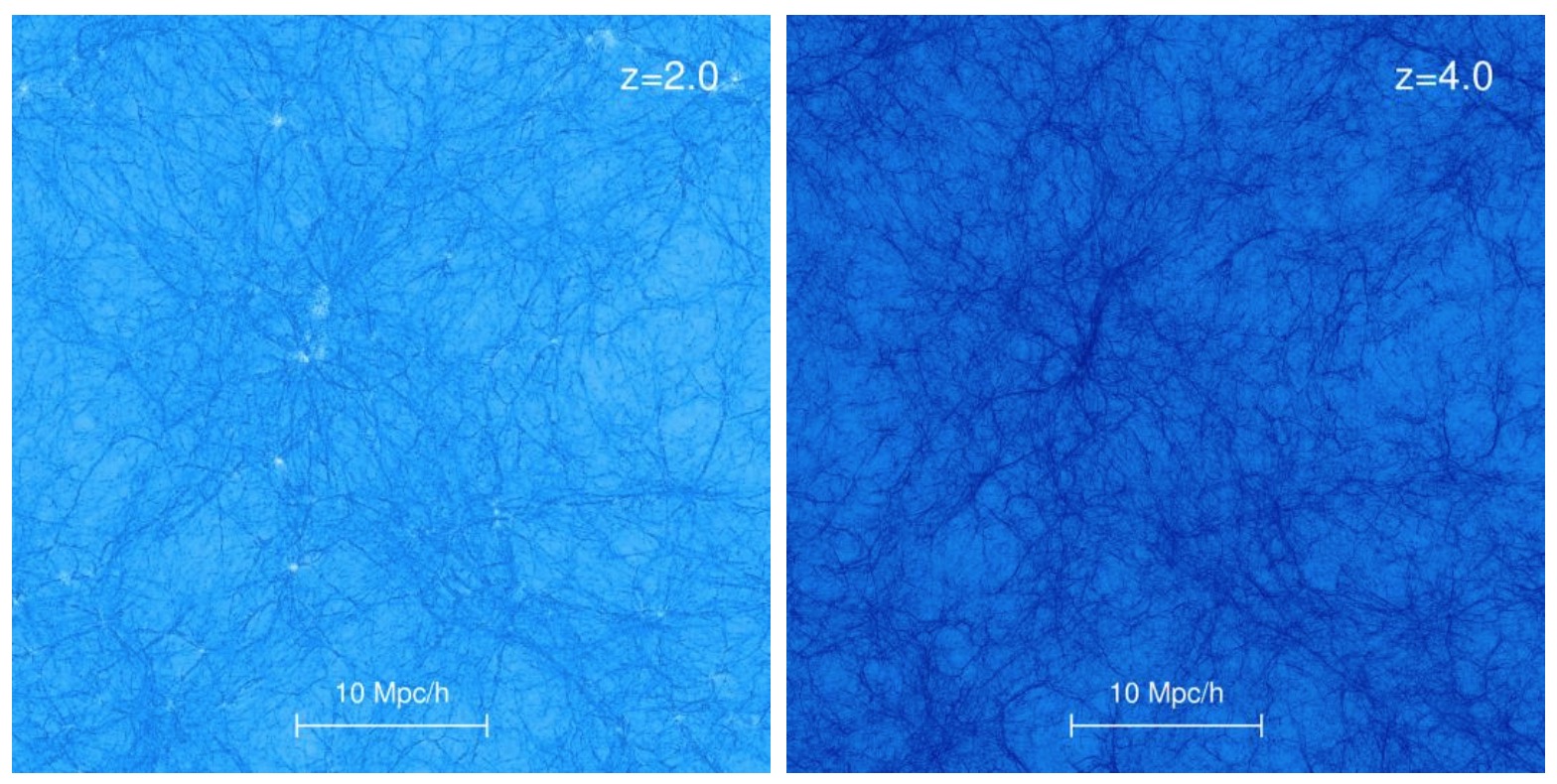 Simulazioni della Foresta di Lyman-alfa (proiezione della frazione di idrogeno neutro con redshift z = 2 e z = 4.0) Crediti: The Sherwood Simulation Suite