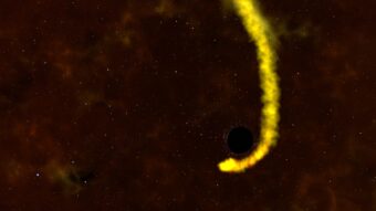 Quando una stella si avvicina troppo a un buco nero, le intense forze mareali la smembrano, generando un flusso di gas la cui coda sfugge al buco nero, mentre il resto inizia ruotargli attorno disponendosi su un disco. Crediti: Goddard Space Flight Center/Nasa