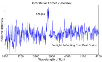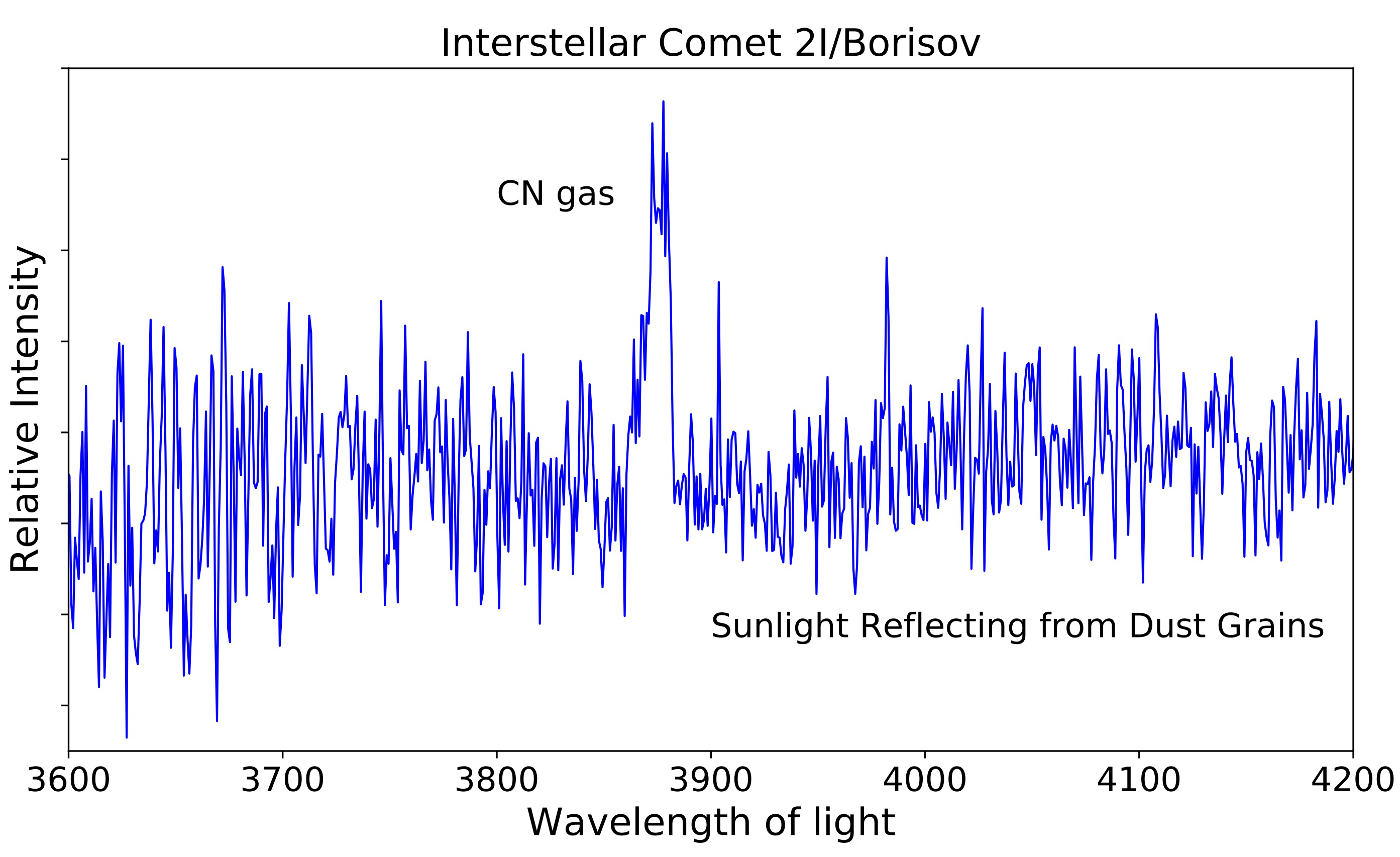 Lo spettro della cometa interstellare 2I / Borisov ottenuto il 20 settembre usando lo spettrografo Isis sul William Herschel Telescope. La luce emessa dalle molecole di cianogeno è chiaramente identificata come picco a maggiore intensità rispetto alla luce riflessa dai granelli di polvere emessi anch’essi dalla cometa. Crediti: Alan Fitzsimmons / Qub