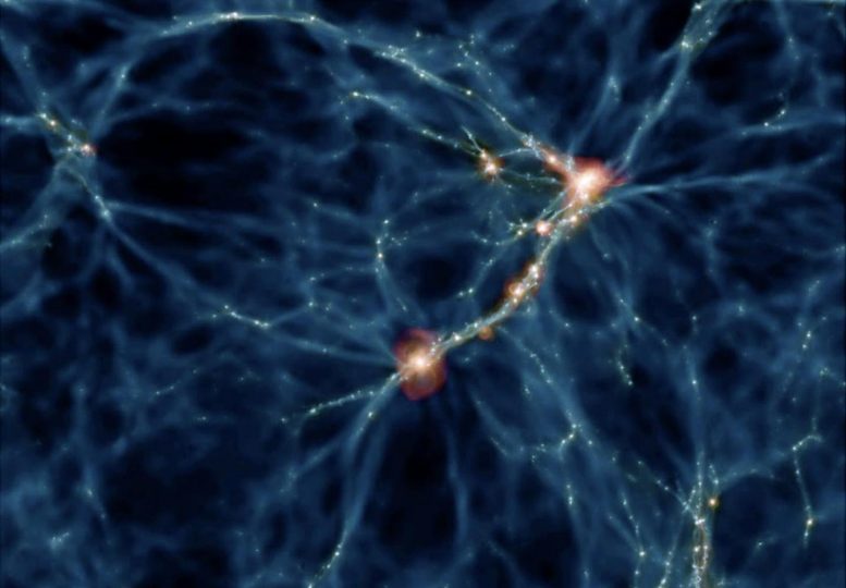 Immagine della simulazione Romulus che raffigura la rete di strutture che si assemblano su scale intergalattiche, rivelando dove si formano le galassie che ospitano i buchi neri. Galassie più massicce che ospitano buchi neri più massicci tendono a vivere in regioni più calde (rosse), mentre le galassie di massa inferiore vivono in regioni più fredde (blu) e ospitano buchi neri più piccoli. Crediti: Yale University