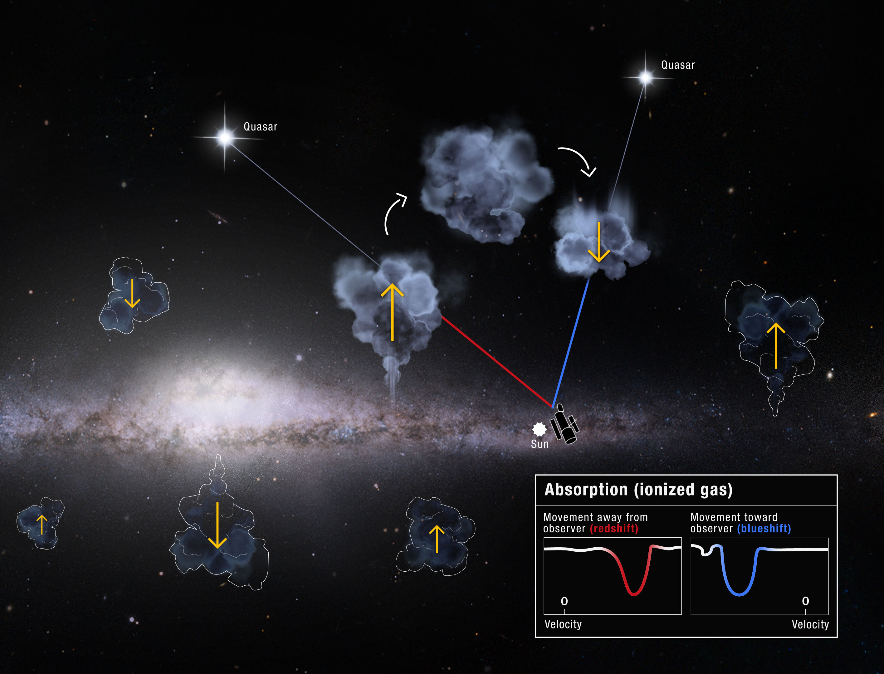 Ma quanto di più? E da dove arriva, quello in eccedenza? Rispondere non è stato semplice: le nubi di gas sono invisibili, come il vento. Dunque non c’è modo di tracciare i loro spostamenti semplicemente osservandole. Gli autori dello studio hanno però trovato un escamotage: le hanno “illuminate” con la luce dei quasar presenti sullo sfondo. Le nubi di gas assorbono infatti alcune particolari frequenze dei potenti fasci di radiazione elettromagnetica emessi dai quasar, e questo assorbimento lascia delle tracce. In particolare, Fox e colleghi si sono concentrati sull’impronta lasciata dal silicio: una firma spettroscopica osservabile dal telescopio spaziale Hubble in ultravioletto.