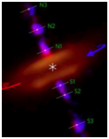 La protostella HH212-mm come osservata dal telescopio Alma. Un disco (in arancione) che ruota e deposita materiale sul piano equatoriale della stella, e un jet supersonico (in violetto) che rilascia momento angolare per mantenere l’equilibrio della protostella centrale. Crediti: Lee et al. 2017