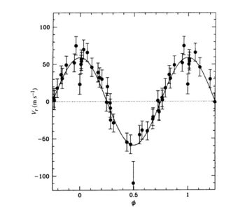 La storica curva di velocità radiale della stella 51 Pegasi ottenuta da Mayor e Queloz: l’oscillazione dimostra l’esistenza di un corpo massiccio e invisibile in orbita attorno alla stella. È la firma inequivocabile di 51 Pegasi b (Nature, 378, 355, nov. 1995)