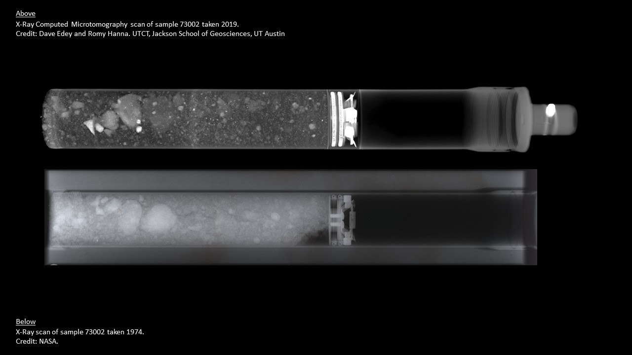 Nel 1974 la Nasa eseguì una scansione del campione 73002 utilizzando la tecnologia radiografica. La scansione di microtomografia computerizzata a raggi X riportata in questa immagine è stata eseguita nel 2019 presso l’Università del Texas ad Austin. Questo è un esempio degli sviluppi tecnologici che stanno permettendo a una nuova generazione di condurre nuove ricerche scientifiche su campioni Apollo. Crediti: Nasa