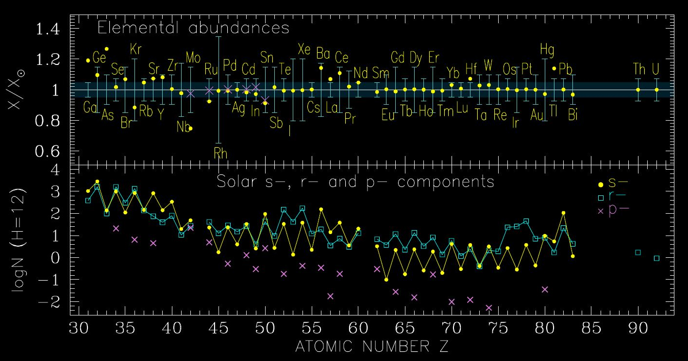 La maggioranza degli isotopi più pesanti del ferro vengono sintetizzati negli interni stellari attraverso due tipi di processi di cattura neutronica: la cattura neutronica lenta (processo “slow”, s) e la cattura neutronica veloce (processo “rapid”, r); alcuni isotopi rari ricchi di protoni vengono invece prodotti nel cosiddetto “processo p”. I modelli teorici che riproducono il “processo r” sono ancora lontani dall’avere un potere predittivo significativo, a causa sia della complessità nel simulare le fasi dell’esplosione, sia delle numerose incertezze sui dati nucleari relativi agli isotopi lontani dalla cosiddetta “valle di stabilità β (beta)”. A causa di queste difficoltà, ad esempio, il contributo del “processo r” alla formazione degli elementi misurati sulla superficie del Sole viene calcolato sottraendo il corrispondente contributo derivante dal processo s (ossia r=1-s).