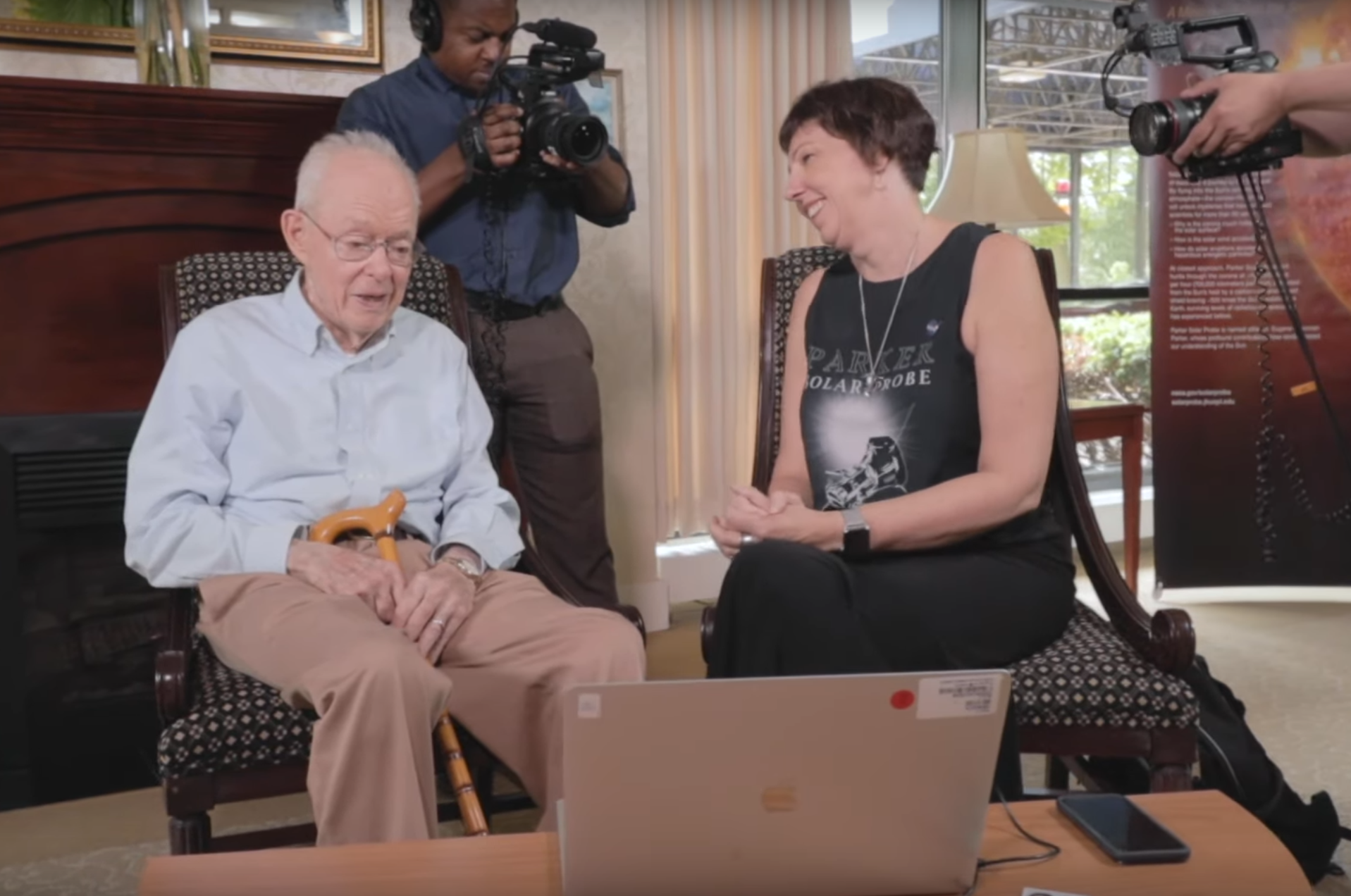 Nicky Fox, project scientist di Parker Solar Probe, mostra in anteprima i primi risultati scientifici della sonda a Eugene Parker, oggi novantaduenne. Crediti: Nasa
