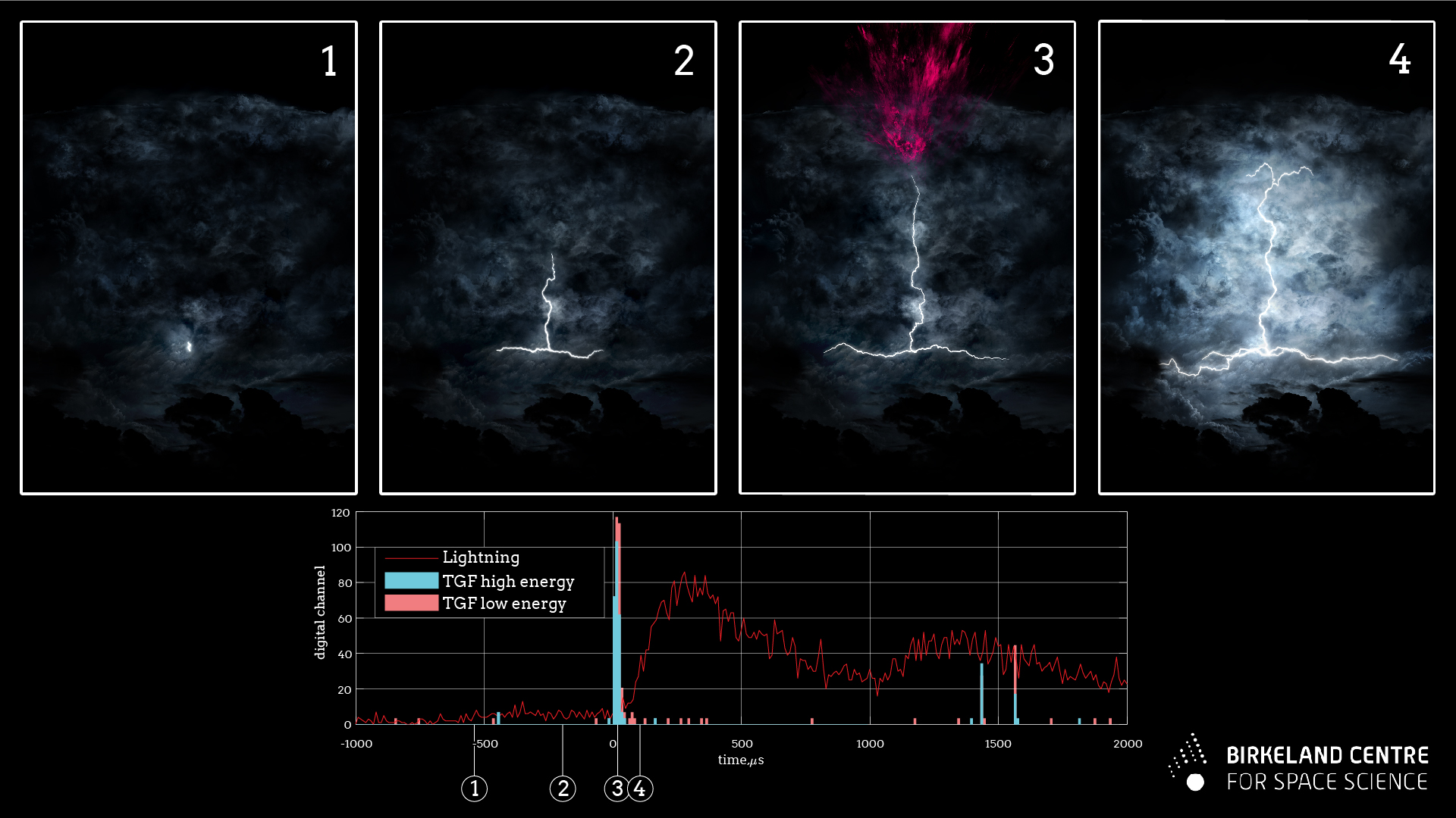 «Comincia tutto con la nascita di un leader: un sottile canale conduttivo che si fa strada rapidamente verso l’alto fra le diverse regioni cariche all’interno di una nube temporalesca», spiega a Media Inaf uno dei coautori dei tre articoli, Martino Marisaldi, professore anch’egli alla University of Bergen e associato all’Inaf Oas di Bologna. La corrente che scorre nel leader per ora è bassa, ma è sufficiente a scaldare l’aria al suo interno. Emettendo luce, può essere osservata dai sensibili fotorivelatori a bordo di Asim. Ma questo è solo l’inizio della storia. Quando il leader si avvicina all’estremità superiore della nube, può innescare un brevissimo ma molto intenso lampo di raggi gamma, un cosiddetto terrestrial gamma-ray flash, o Tgf, anche questo misurato dai rivelatori di alta energia di Asim. Il leader può poi continuare la sua corsa, ma poco dopo – al massimo pochi decimi di millisecondo – l’interruttore, per così dire, fra le diverse regioni di carica della nube si chiude. E un’enorme corrente fluisce attraverso il leader, producendo la luce – ancora una volta misurata da Asim – che noi comunemente percepiamo come un lampo, un fulmine all’interno della nube».