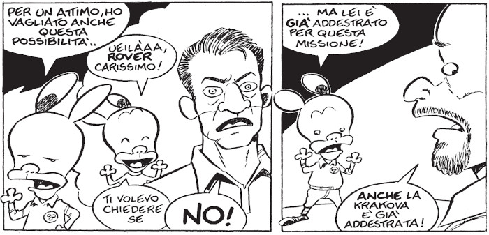 Quest’ultimo è il personaggio interpretato da Rat-Man, che da parodia di supereroe diventa, in un certo senso, attore in quello che può essere considerato il secondo blockbuster spaziale di Ortolani. La presenza del personaggio con la maschera da topo dà al tempo stesso continuità narrativa con C’è spazio per tutti, anche grazie a un riferimento esplicito a quel primo volume, ma anche rottura con quel lavoro, visto che in questa occasione Rat-Man veste i panni di un ricco magnate impegnato a tornare sulla Luna, così come il suo epigono nella vita reale, Elon Musk, è impegnato a portare l’uomo su Marte. Ovviamente il ruolo che interpreta non snatura il personaggio, ingenuo, ma anche idiota, e soprattutto mai domo, sempre pronto a intraprendere nuove sfide.