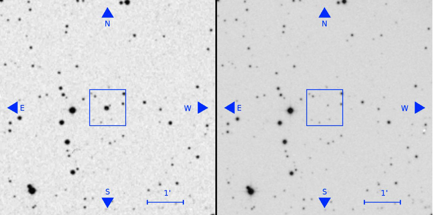 In alto una antica mappa nella quale è visibile, all’interno del riquadro, una sorgente luminosa puntiforme scomparsa in una lastra più recente (in basso). Crediti: Villarroel et al., 2019