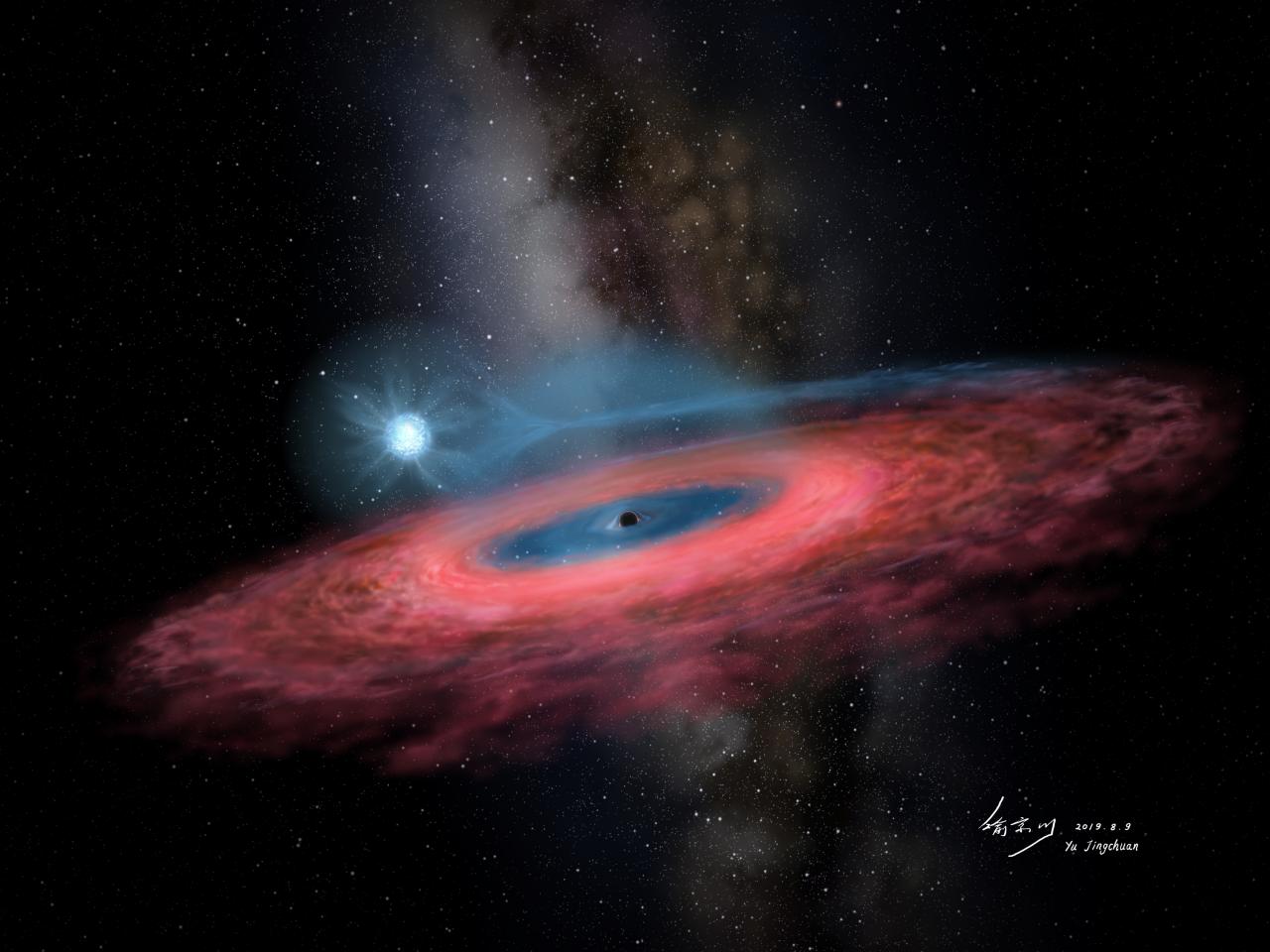 Impressione artistica del presunto buco nero stellare Lb-1 con la stella Ls V+22 25 che gli orbita attorno. Crediti: Jingchuan Yu
