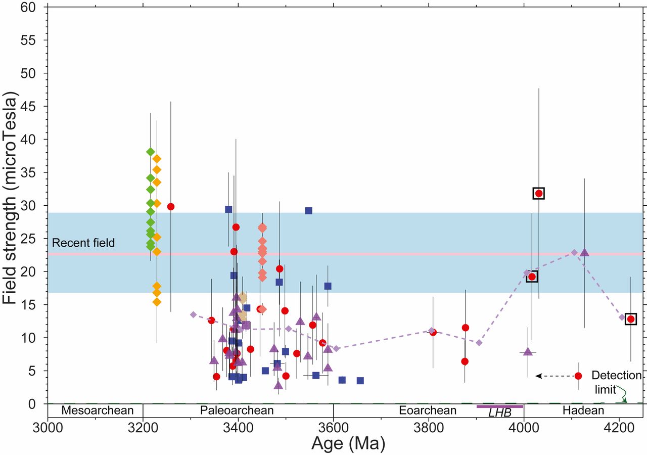 Variazione dell’intensità del campo magnetico terrestre da 3.0 a 4.2 miliardi di anni fa in base ai dati raccolti nello studio. La linea rosa indica invece la media dei valori relativi agli ultimi 800mila anni. Fonte: Tarduno et al., Pnas, 2020