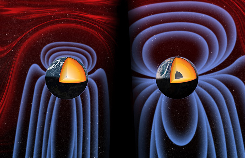 Il campo magnetico terrestre viene generato nel suo nucleo di ferro liquido da una geodinamo. Si ritiene che una geodinamo fosse già attiva agli albori della storia della Terra, per poi indebolirsi nei successivi miliardi di anni fino a raggiungere un punto critico 565 milioni di anni fa (immagine a sinistra). Fu a questo punto che iniziò a formarsi il nucleo interno, con conseguente aumento della forza della geodinamo e del campo magnetico (immagine a destra). Crediti: University of Rochester / Michael Osadciw