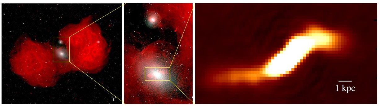 «Più recentemente, attorno a tre milioni di anni fa», dice Maccagni a Media Inaf, «una fase meno potente e ancora più breve, della durata di circa un milione di anni, ha generato i getti centrali a forma di S (vedi la figura qui sotto) che, pur relativamente piccoli, grazie alla sensibilità di MeerKat, sono ora perfettamente visibili, ed è stato possibile studiarli in dettaglio per la prima volta. Attualmente, i getti non sono più arricchiti di nuove particelle dal nucleo centrale ma sono anch’essi in una fase morta. La rapida intermittenza dell’attività del nucleo galattico attivo di FornaxA sarebbe causata da ricorrenti episodi di accrescimento del buco nero supermassiccio presente al centro della galassia».