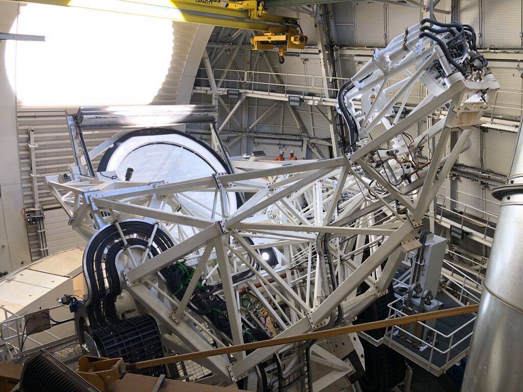 Uno scorcio della montatura del DKI Solar Telescope in cui si può vedere (sulla dx) il sistema di raffreddamento posto prima dello specchio secondario. Crediti: Nso/Aura/Nsf
