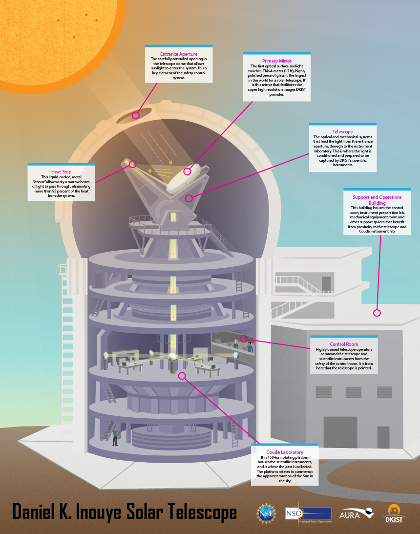 «Tutto ruota intorno al campo magnetico», spiega Thomas Rimmele, direttore dell’Inouye Solar Telescope. «Per decifrare i meccanismi che stanno alla base di molti fenomeni solari ancora non compresi, non solo dobbiamo essere in grado di distinguere chiaramente queste strutture dalla distanza della Terra, 150 milioni di km, ma dobbiamo anche riuscire a misurare l’intensità e direzione del loro campo magnetico, nonché tracciarne comportamento ed evoluzione dalla superficie fino alla parte esterna dell’atmosfera, chiamata corona, uno strato molto rarefatto, ma dove le temperature raggiungono il milione di gradi».