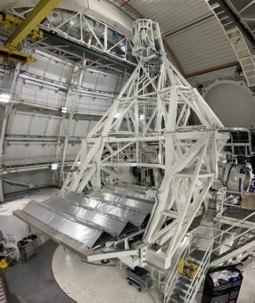 Il telescopio vero e proprio all’interno della cupola, con lo specchio da 4 metri coperto da una cortina a chiusura rapida per evitare che si trasformi incidentalmente in uno “specchio ustorio”. Crediti: Nso/Aura/Nsf