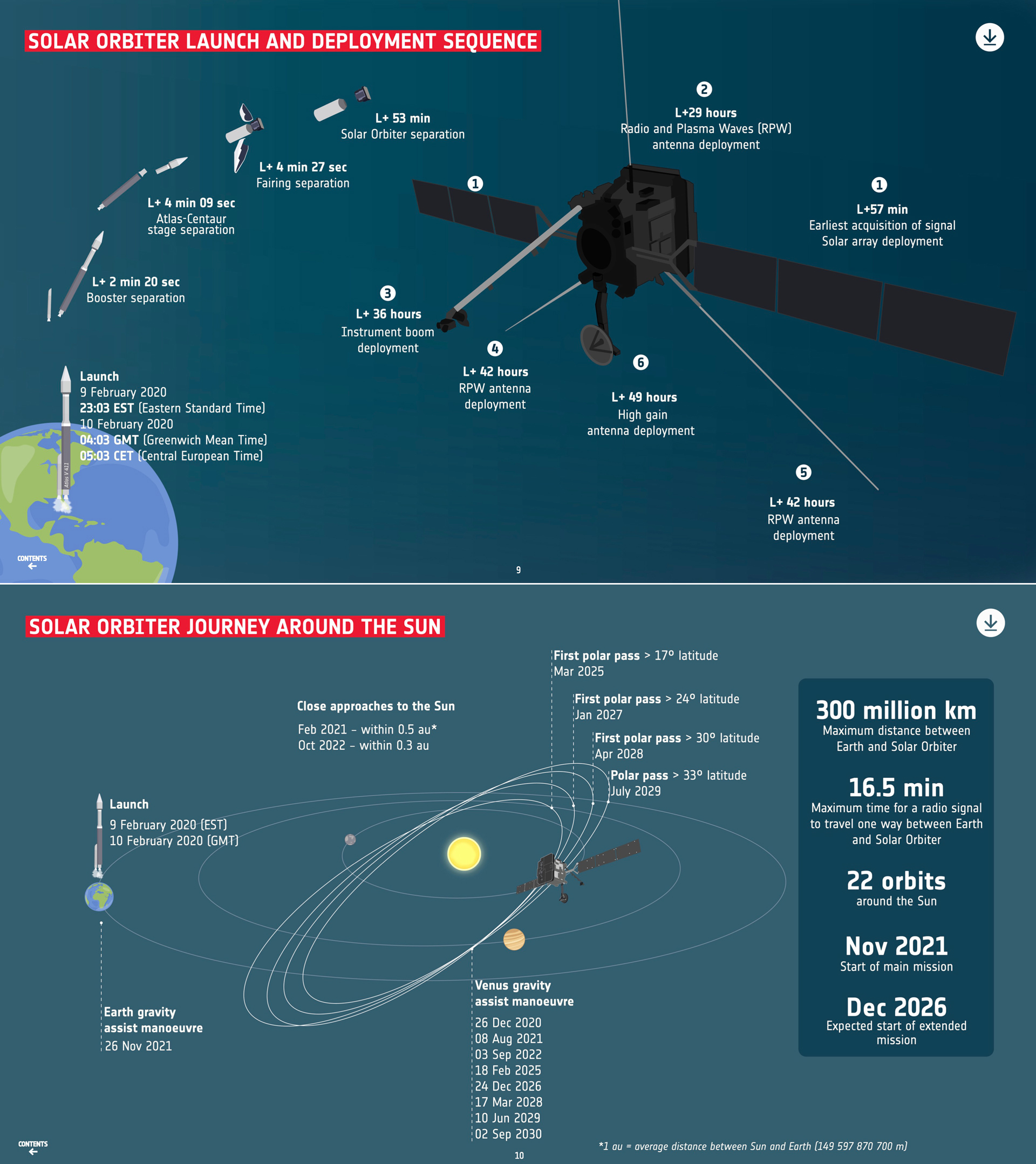 Ecco le principali tappe in programma, a breve e a lungo termine. Circa 53 minuti dopo il lancio, alla fine della sequenza standard di separazione dai vari stadi, la navicella spaziale si troverà a viaggiare da sola verso la sua destinazione. Quattro minuti più tardi si apriranno i pannelli solari e verrà stabilito il primo contatto con la Terra. Trascorse altre 28 ore avrà inizio una lunga sequenza di dispiegamenti, che richiederà circa 13 ore per essere completata: si parte con l’antenna per le onde radio e al plasma, poi il braccio telescopico con gli strumenti sensibili ai campi magnetici (che devono dunque essere posizionati a una certa distanza dalla sonda) e infine altre tre antenne, compresa quella ad alto guadagno. A questo punto la navicella spaziale dovrebbe essere in “assetto da combattimento”.
