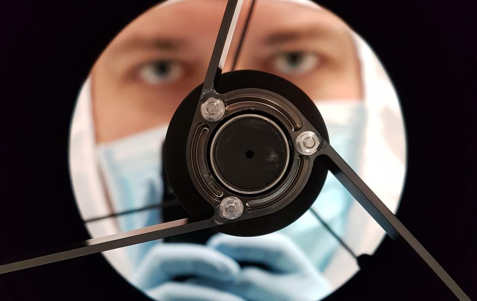 Dettaglio dello specchio secondario di Cheops (il cerchio nero in primo piano) con i suoi tre bracci di sostegno. Sullo sfondo, lo specchio primario, sul quale si riflette il volto di un ricercatore. Crediti: University of Bern, T. Beck