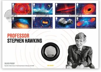 Per 65 sterline si può ordinare un kit con gli 8 francobolli in prima emissione e una moneta di argento fior di conio dedicata a Stephen Hawkings