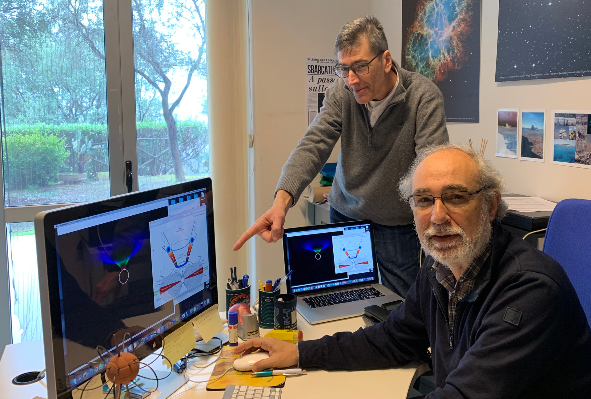 Paolo Leto (in piedi) e Corrado Trigilio (seduto), ricercatori all’Osservatorio di astrofisica dell’Inaf di Catania, davanti al modello da loro messo a punto. Crediti: Grazia Umana/Inaf