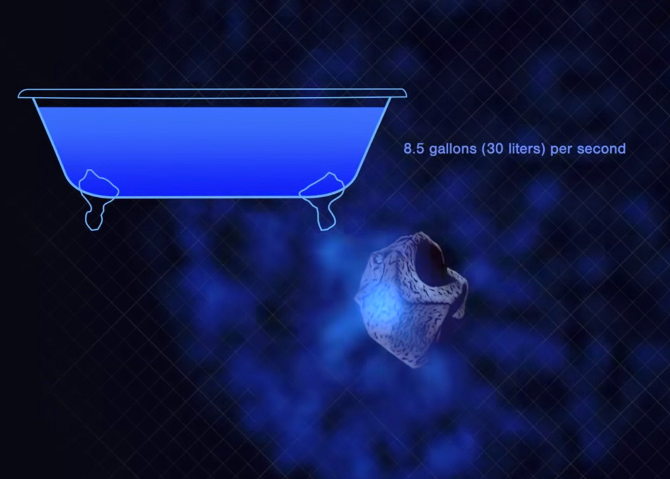 Dal primo di novembre al primo di dicembre, sette giorni prima che la cometa raggiungesse il punto più vicino al Sole, è stato osservato un aumento del 50 per cento della quantità di idrossile – e quindi di acqua – prodotta da 2l/Borisov. All’apice del suo avvicinamento, la cometa ha versato circa 30 litri di acqua al secondo: abbastanza da riempire una vasca da bagno in circa 10 secondi. I ricercatori stimano che durante tutto il suo viaggio attraverso il Sistema solare la cometa abbia perso quasi 230 milioni di litri di acqua – l‘equivalente di oltre 92 piscine olimpioniche.