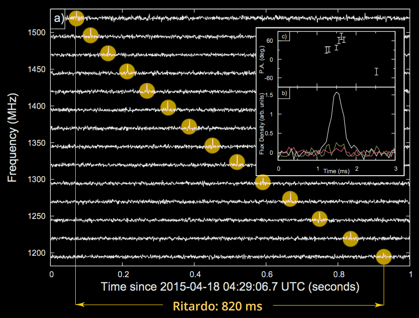 «È vero che per ora non abbiamo ancora visto alcun Frb, ma è perché abbiamo appena cominciato. Il nostro è al momento uno studio pilota», sottolinea Bernardi, «la dimostrazione della fattibilità di un concetto. D’altronde, la Croce del Nord non nasce come strumento per osservare transienti veloci. Ma negli ultimi anni è stato fatto molto lavoro per trasformare il backend, con due obiettivi. Primo, arrivare a disporre di un sistema di acquisizione che potesse formare un beam del telescopio puntato in una direzione, acquisire dati e campionarli alla risoluzione temporale che necessaria per gli Frb, dunque sotto al millisecondo. Secondo obiettivo era allargarne la banda di acquisizione, che era inizialmente molto stretta – circa 4 MHz attorno ai 408 MHz. E l’ampiezza della banda di acquisizione non è importante solo per la sensibilità, ma anche perché quelli degli Frb sono segnali “dispersi”, e questa dispersione ha una caratteristica dipendenza in frequenza [ndr. vedi grafico qui sotto]. Dunque coprire una frequenza più ampia ti dà la possibilità, per esempio, di distinguere tra segnali impulsivi celesti e segnali impulsivi dovuti, invece, a interferenze».