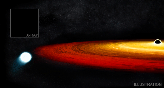 Per Andrew King, professsore alla University of Leicester (Regno Unito) e unico autore della pubblicazione, quelle emissioni X ripetute ogni 9 ore provenienti dal buco nero sarebbero i “ruttini” prodotti in seguito a tre pasti giornalieri di materia stellare. La materia d’una stella catturata dalla sua gravità che ha iniziato a orbitarlo alimentandolo a ogni rivoluzione. Per l’esattezza, la materia appartiene a una nana bianca, e cade nel disco che circonda il buco nero ogni qualvolta nella sua orbita – una ogni nove ore, appunto – essa si trova al perielio, il punto più vicino al buco nero, non più di 15 volte il raggio dell’orizzonte degli eventi. Punto nel quale lo scienziato stima che la coppia possa produrre anche onde gravitazionali.
