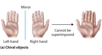 L’esempio classico che si fa per spiegare questa caratteristica è quello della mano. Le nostre mani sono strutturalmente simili, ma se proviamo a sovrapporle l’una sull’altra queste non coincideranno. Ce ne accorgiamo ad esempio quando tentiamo di infilarci un guanto sinistro nella mano destra o viceversa. Le nostre mani sono quindi chirali e ciascuna, come si direbbe in “chimichese” parlando di molecole chirali, è un “enantiomero”: membri di una coppia speculari l’uno dell’altro.