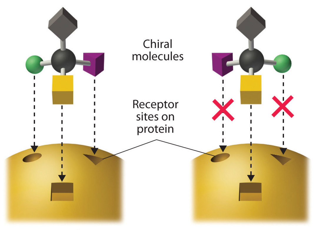 Illustrazione che mostra l’interazione delle molecole chirali con i recettori biologici. Crediti: Chemistry: Principles, Patterns, and Applications