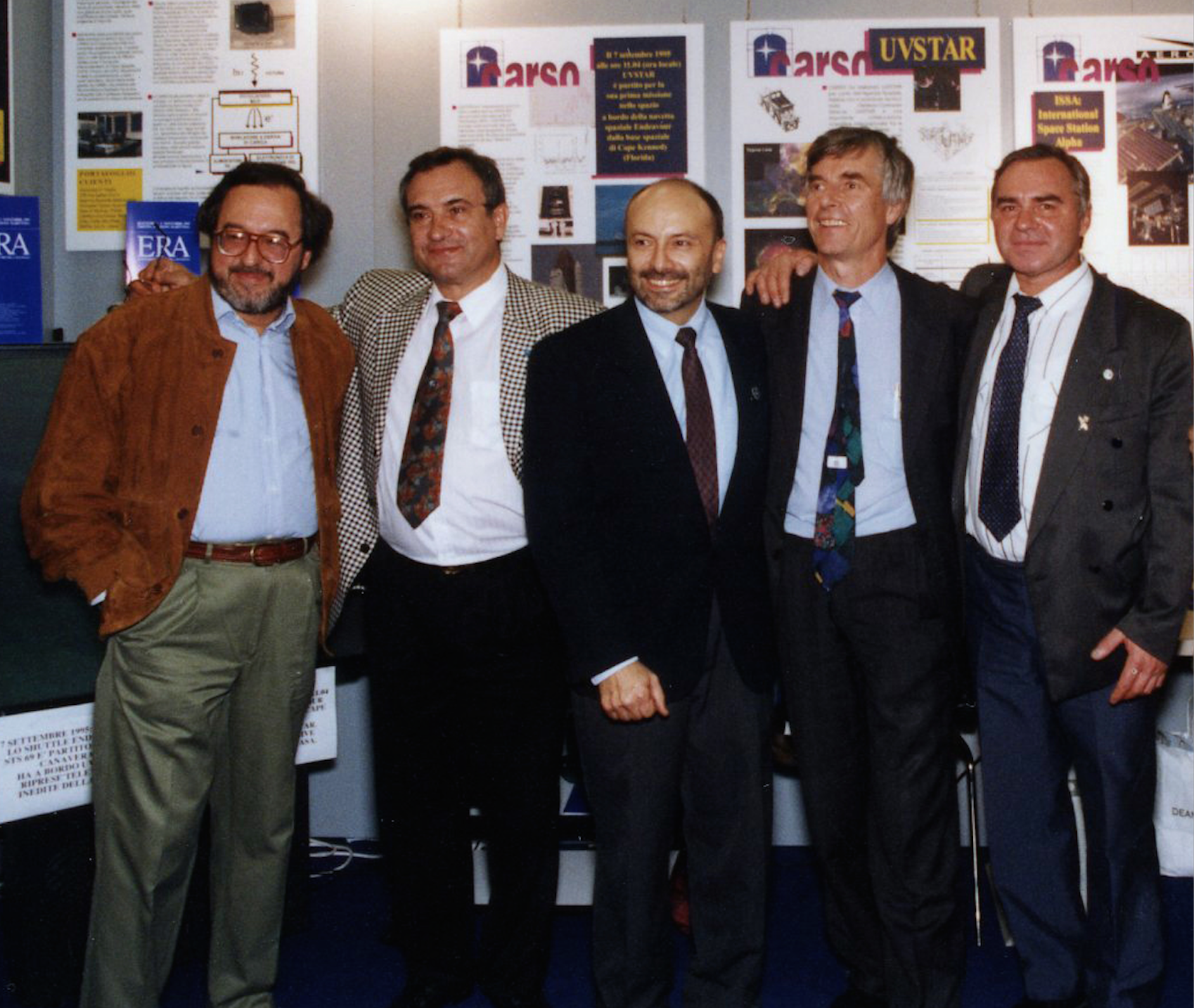 Fabio Pagan, primo a sinistra, con un gruppo di astronauti e cosmonauti a Trieste nel 1995. A seguire: Valeri Polyakov, medico e cosmonauta, due soggiorni di lunga durata a bordo della stazione spaziale Mir tra il 1988 e il 1995, rispettivamente di 240 e di 437 giorni (che rappresenta tuttora il record di permanenza in orbita in un’unica missione), nel corso dei quali effettuò sei uscite extra-veicolari; Franco Malerba, ingegnere e fisico, astronauta Asi, primo italiano nello spazio (Shuttle Atlantis, 1992); Ulf Merbold, fisico e astronauta Esa, tra il 1983 e il 1994 due volte in orbita con lo Shuttle e una volta sulla Mir con la Soyuz nel 1994; Aleksandr Viktorenko, pilota collaudatore, quattro volte sulla stazione Mir tra il 1987 e il 1995 per un totale di 489 giorni in orbita, effettuando sei volte attività extra-veicolare. Crediti: F. Pagan